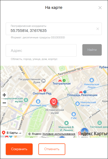 - В открывшемся окне при необходимости укажите географические координаты или выберите на карте. Либо укажите адрес и нажмите кнопку «Найти».