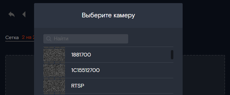 - Чтобы добавить камеру в ячейку раскладки, в пустой ячейке нажмите «+» и выберите нужную камеру в появившемся списке. В раскладку можно добавить любую камеру аккаунта, в том числе предоставленную вам по приглашению через почту, RTSP-камеру или не вещающую прямой эфир. Можно установить одну и ту же камеру в несколько ячеек раскладки.